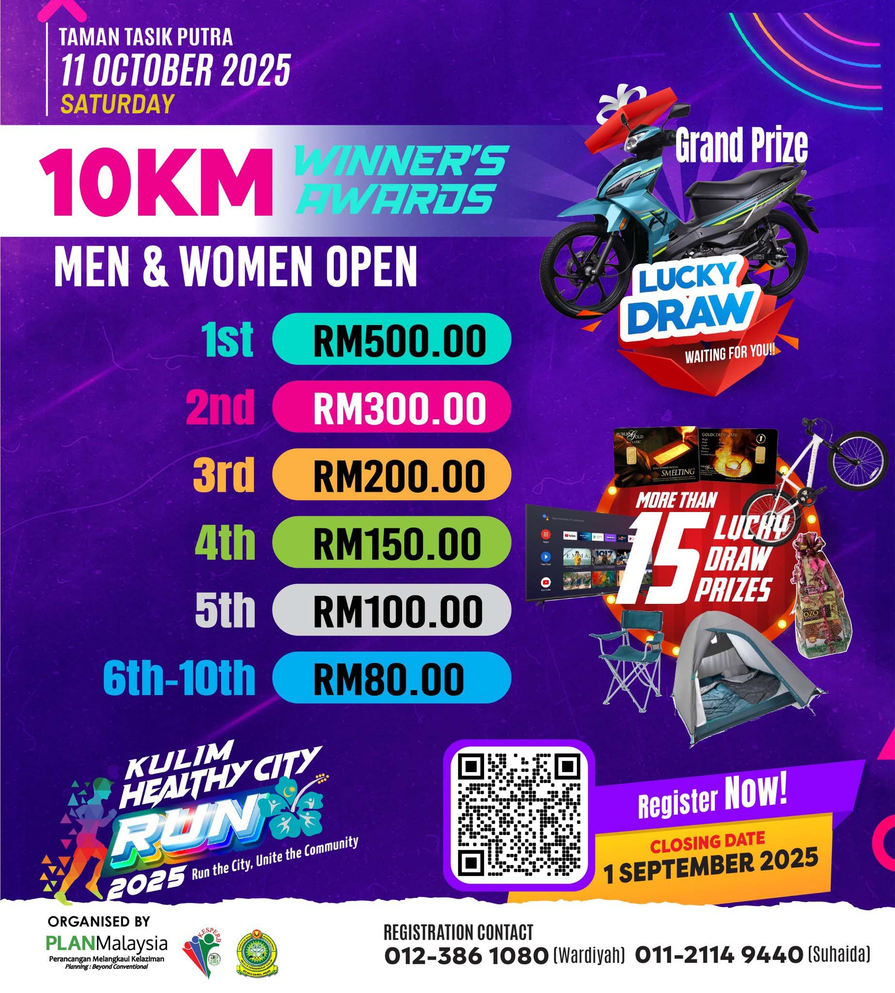 Join us for a vibrant community run in Kulim with 3KM, 5KM, and 10KM Open categories. Enjoy a healthy day out with lucky draw prizes, finisher medals, and winner awards for 10KM Open. All participants receive a race kit and T-shirt. Let’s unite for health and community spirit!