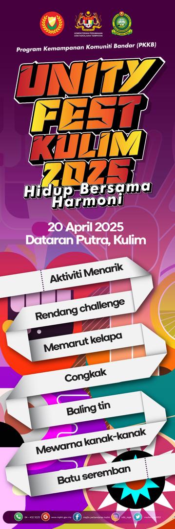 Join us for an exciting day of fun and unity at the Unity Fest Kulim 2025! This vibrant event features a thrilling fun walk, along with a variety of engaging activities for all ages, including the Rendang Challenge, Memarut Kelapa, Congkak, Baling Tin, Mewarna Kanak-Kanak, and Batu Seremban. Celebrate togetherness, culture, and fun as we embrace the spirit of harmony in our community!